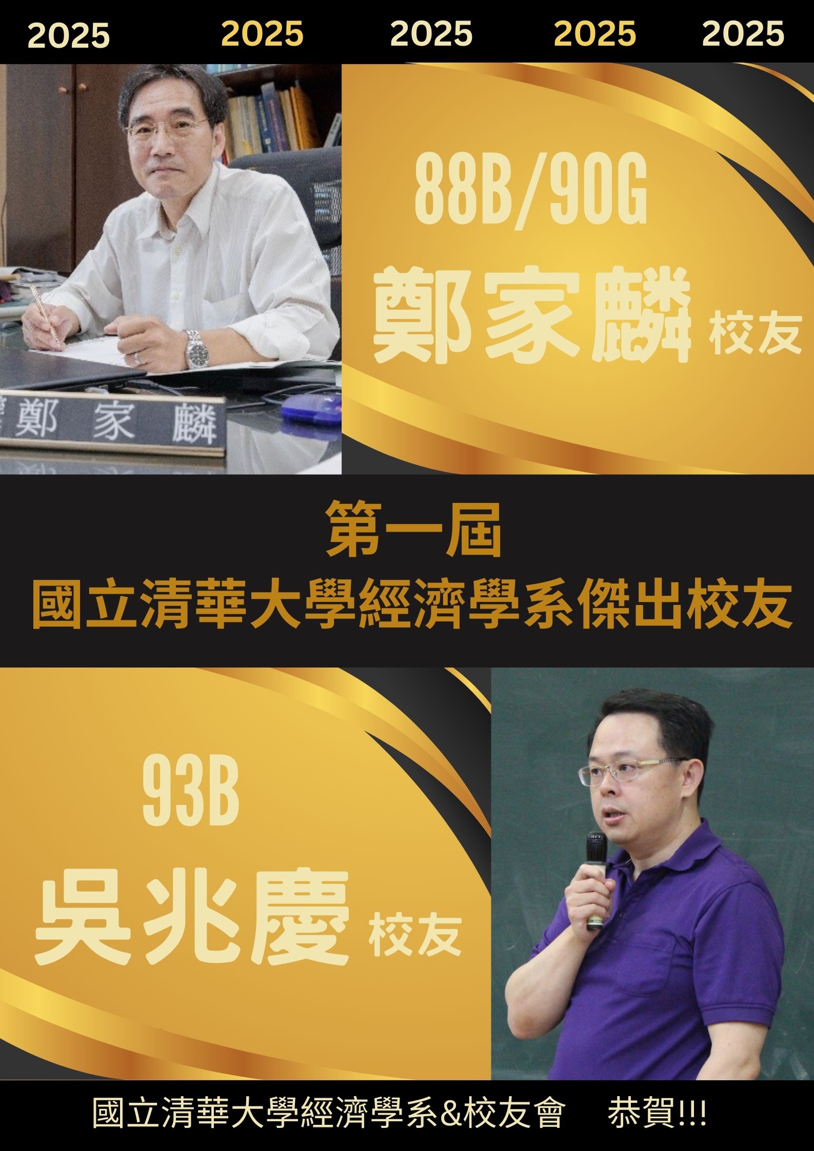 【系辦公告】恭賀_ 88B/90G鄭家麟校友 & 93B吳兆慶校友 榮獲第一屆經濟系傑出校友獎